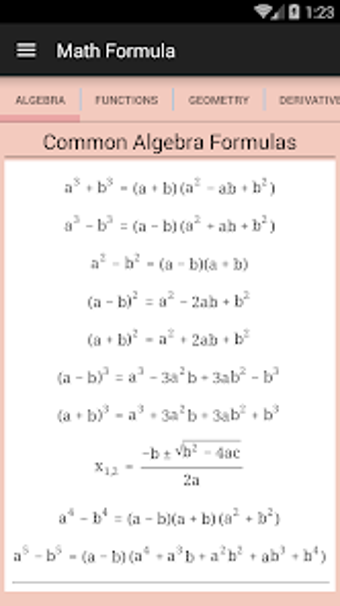 Math Formula is an Android application developed by MRA17. It is a free education and reference app that aims to provide users with a comprehensive collection of math formulas and equations. With a wide range of topics covered, this app is a valuable resource for students, teachers, and anyone who needs quick access to mathematical formulas.